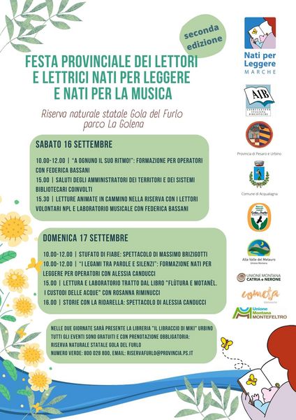 La 2° edizione della Festa dei lettori e della lettura dei Sistemi Bibliotecari dell'entroterra della provincia di Pesaro e Urbino, organizzata grazie al contributo della Regione Marche e al sostegno di: Associazione Italiana Biblioteche sezione Marche, Comune di Acqualagna, Riserva naturale Gola del Furlo, Unione Montana Alta Valle del Metauro, Unione Montana Catria e Nerone, Sistema bibliotecario Colli al Metauro, Unione Montana del Montefeltro.