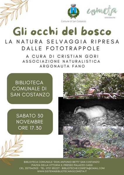 Il biologo Cristian Gori ci presenterà i video più spettacolari ripresi dalle fototrappole dell'Associazione Argonauta di Fano, per conoscere da vicino la fauna locale.