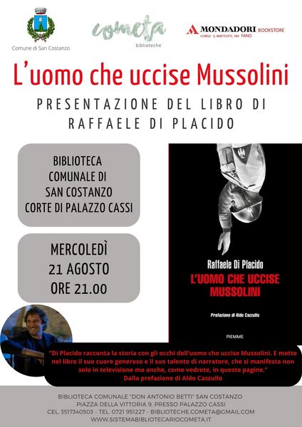 In collaborazione con la libreria Mondadori di Fano, ,nella corte di Palazzo Cassi, un incontro con Raffaele Di Placido, biologo marino, autore e divulgatore televisivo, che presenterà il libro L'uomo che uccise Mussolini, edito da Piemme con la prefazione di Aldo Cazzullo, che racconta uno degli episodi più decisivi del Novecento italiano.