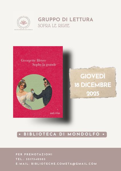 Appuntamento di dicembre del gruppo di lettura Sopra le righe con Sophy la grande di Georgette Heyer (ed. Astoria): "Insieme con il padre diplomatico, la ventenne Sophy ha viaggiato in lungo e in largo ed è convinta di aver capito il mondo. Così, quando si ritrova a Londra, a casa della zia e dei cugini, decide di mettere al servizio di coloro che le stanno intorno la sua mente così brillante. E sono parecchie le cose che, secondo Sophy, vanno raddrizzate: il rapporto tra il cugino Charles e la sua rigidissima fidanzata; le illusioni che la cugina Cecilia nutre nei confronti di un giovane poeta così privo di senso pratico da non essere neppure capace di chiamare una carrozza quando piove; e poi c’è la zia, che ha bisogno d’aiuto per raddrizzare le sue finanze. Sophy sa esattamente come risolvere tutto: basta capovolgere ogni cosa. Che gli altri lo vogliano o no" (dal sito dell'editore).