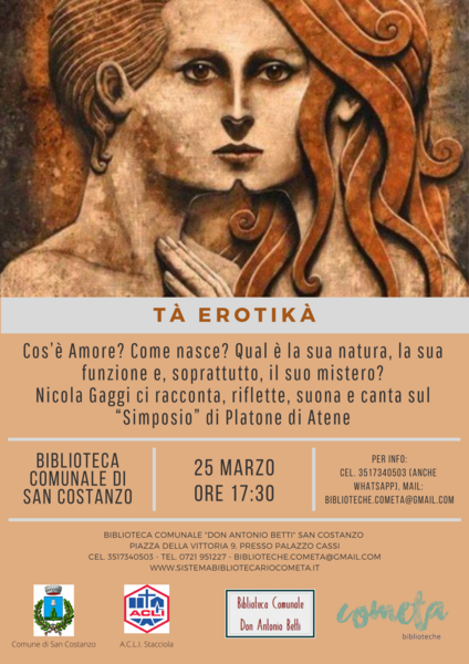 Primo appuntamento della rassegna primaverile con uno spettacolo in cui l'attore e musicista Nicola Gaggi racconterà, rifletterà e suonerà sul Simposio di Platone, un viaggio nei significati della parola amore tra mito e psiche, divinità e umanità.