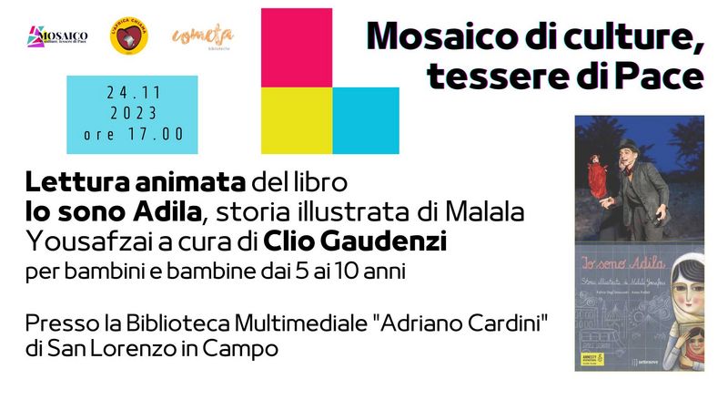 Nell’ambito del progetto "Mosaico di culture, tessere di pace" cofinanziato dalla Regione Marche, Dipartimento Politiche Sociali, lavoro, istruzione e formazione, nell’ambito del bando Welfare Culturale, l'associazione L’Africa Chiama presenta la lettura animata del libro Io sono Adila, la storia illustrata di Malala Yousafzai, a cura di Clio Gaudenzi, per bambine e bambini dai 5 ai 10 anni.